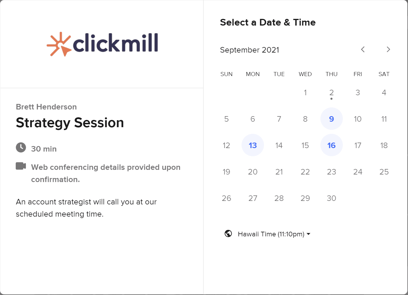 We have used Calendly with our Christian school clients and our own strategy sessions and it works great. Your Calendly calendars allow you to track conversion and they embed right into your school’s website which makes for a great user experience. Here is an image of a Calendly calendar on our website.